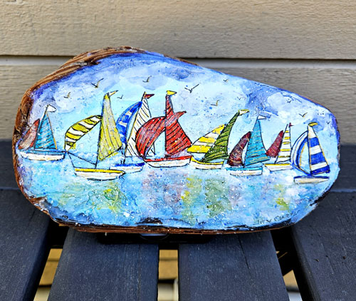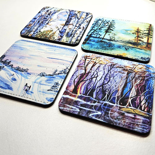 Original watercolour art on paper, wood and driftwood. Prints, cards, bookmarks, calendars, magnets, art blocks all made by us from Jen's art in our home studio. Pillow covers, coasters, purses, notebooks and bags made for us in Montreal using Jen's art and designed by us.